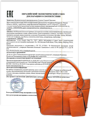 Согласно техрегламентам, сертификация сумок или декларирование обязательная процедура для продажи большинства детских и взрослых кожгалантерейных товаров. Для того, чтобы получить документ, подтверждающий законность применения изделий (сертификат или декларацию) необходимо проверить продукцию на устойчивость окраски, прочность ниточного и сварного швов, наличие вредных химических веществ и предоставить еще немало информации по вопросам, связанным с качеством и безопасностью товара.